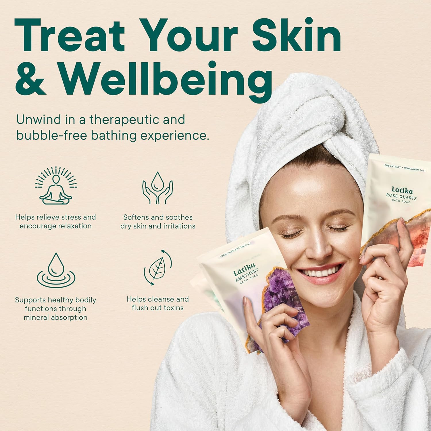 - SKIN NOURISHMENT β Infused with natural minerals and vitamin E, our Geode-inspired bath salts provide luxurious hydration. Enjoy silky-smooth, healthy skin after each soak, enriched with essential oils from rose quartz, lavender, fir needle, and cedar bark.