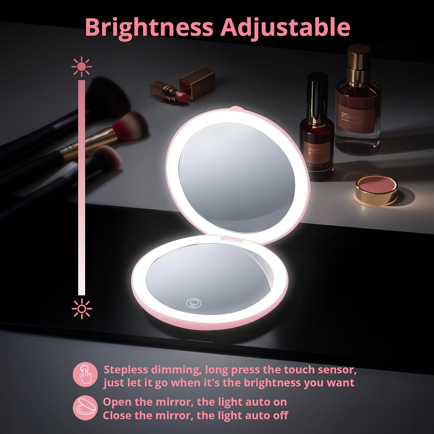 - 3 Color Lights & Stepless Dimming: Electric illuminated mirror provides warm/natural/cool light to meet the makeup needs of date/outside/office. Tap the sensor to turn ON/OFF the lighting, long press 3s to adjust the brightness. The light will automatically turn on or off as the mirror opens and closes